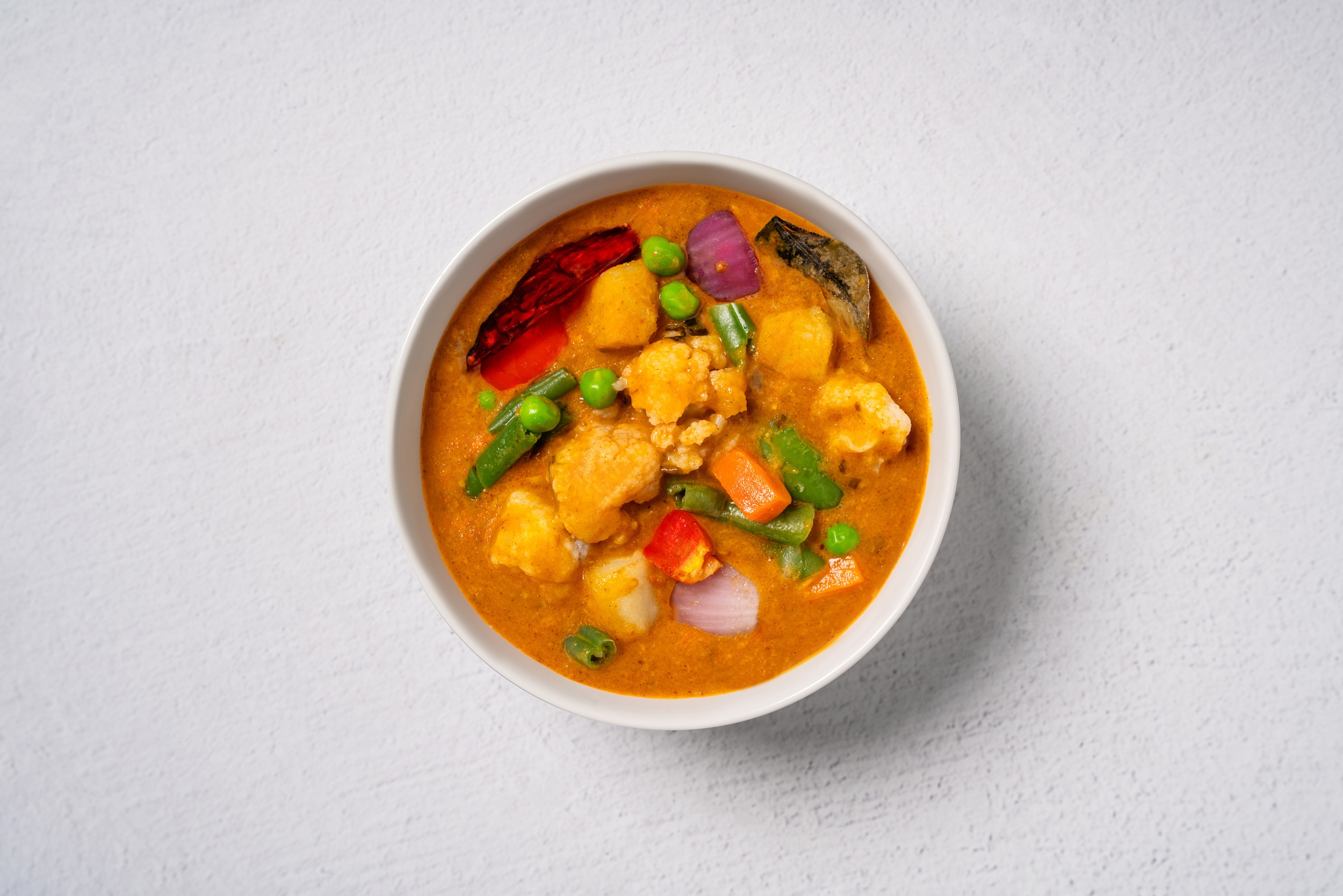 Fresh bell peppers, onions, potatoes, carrots, green beans, green peas, and cauliflower simmered in sour succulent spicy house curry sauce.