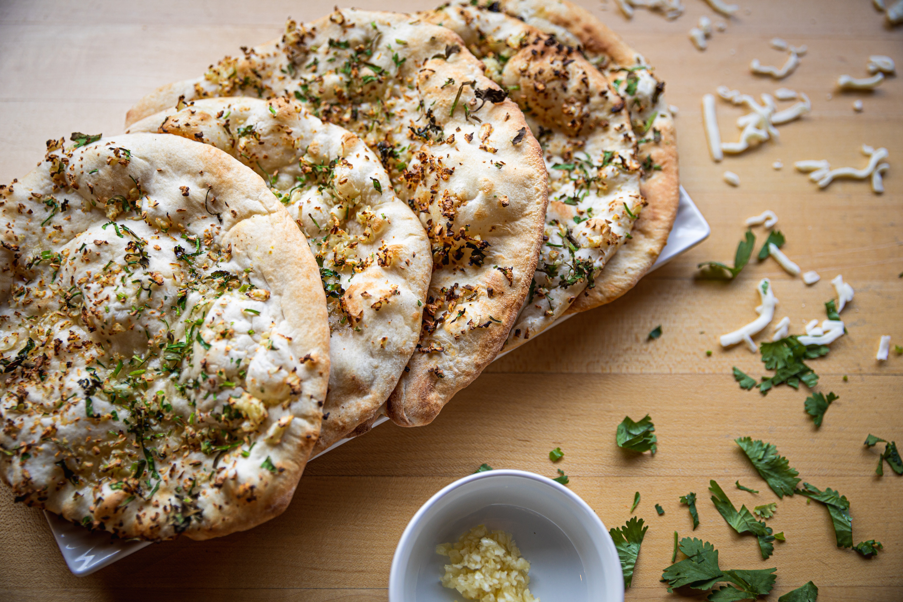 Garlic, cilantro and cheese coated leavened flatbread