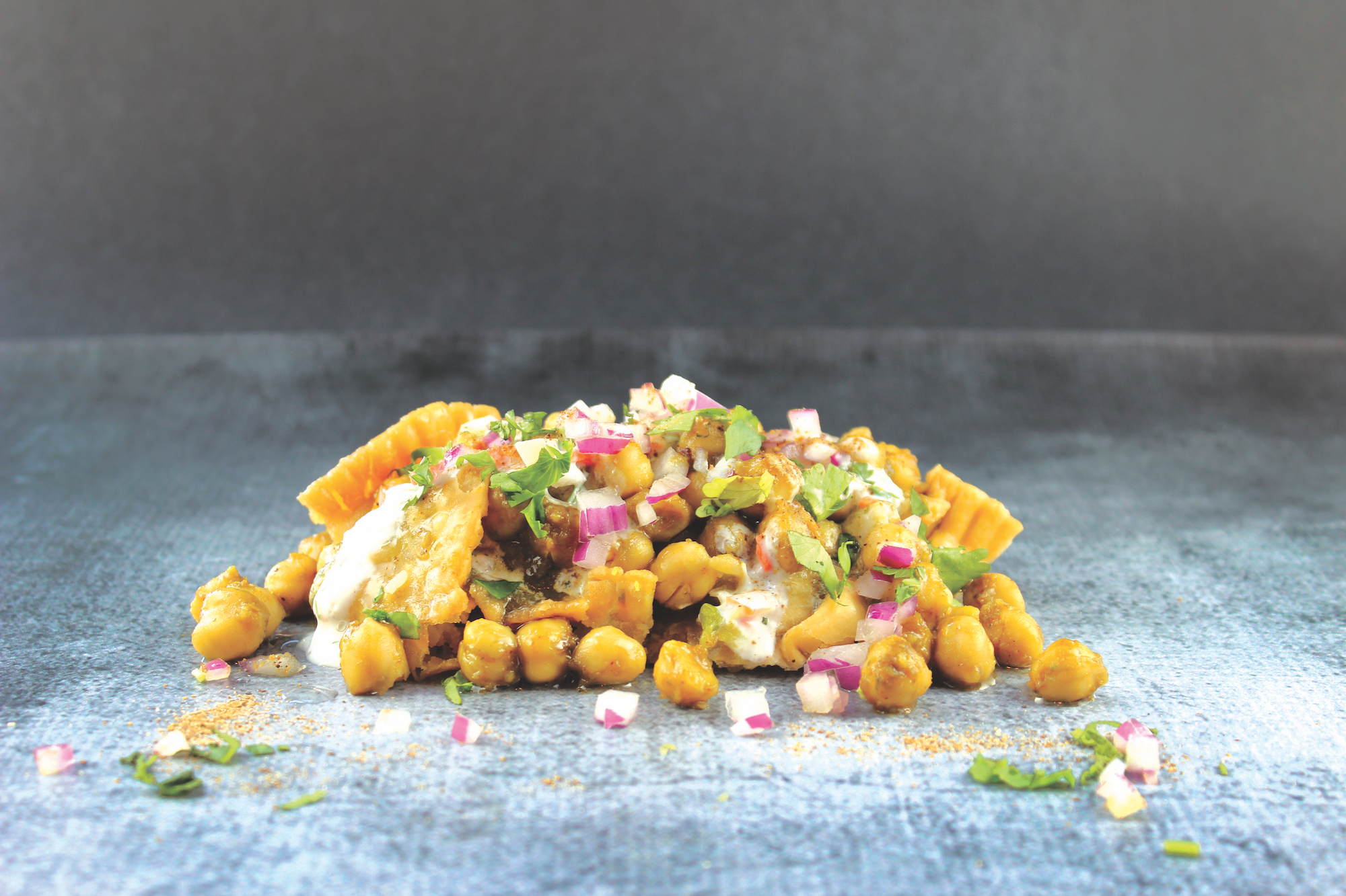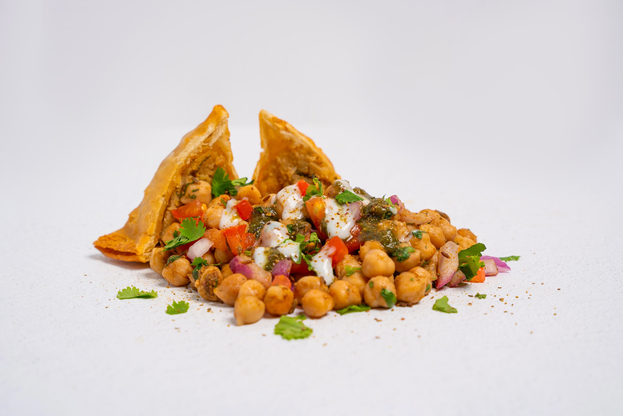 Samosa or crispy potato fritters aka, aloo tikki, seasoned chickpeas, yogurt sauce, tamarind and mint chutney, red onion, tomatoes, and cilantro.