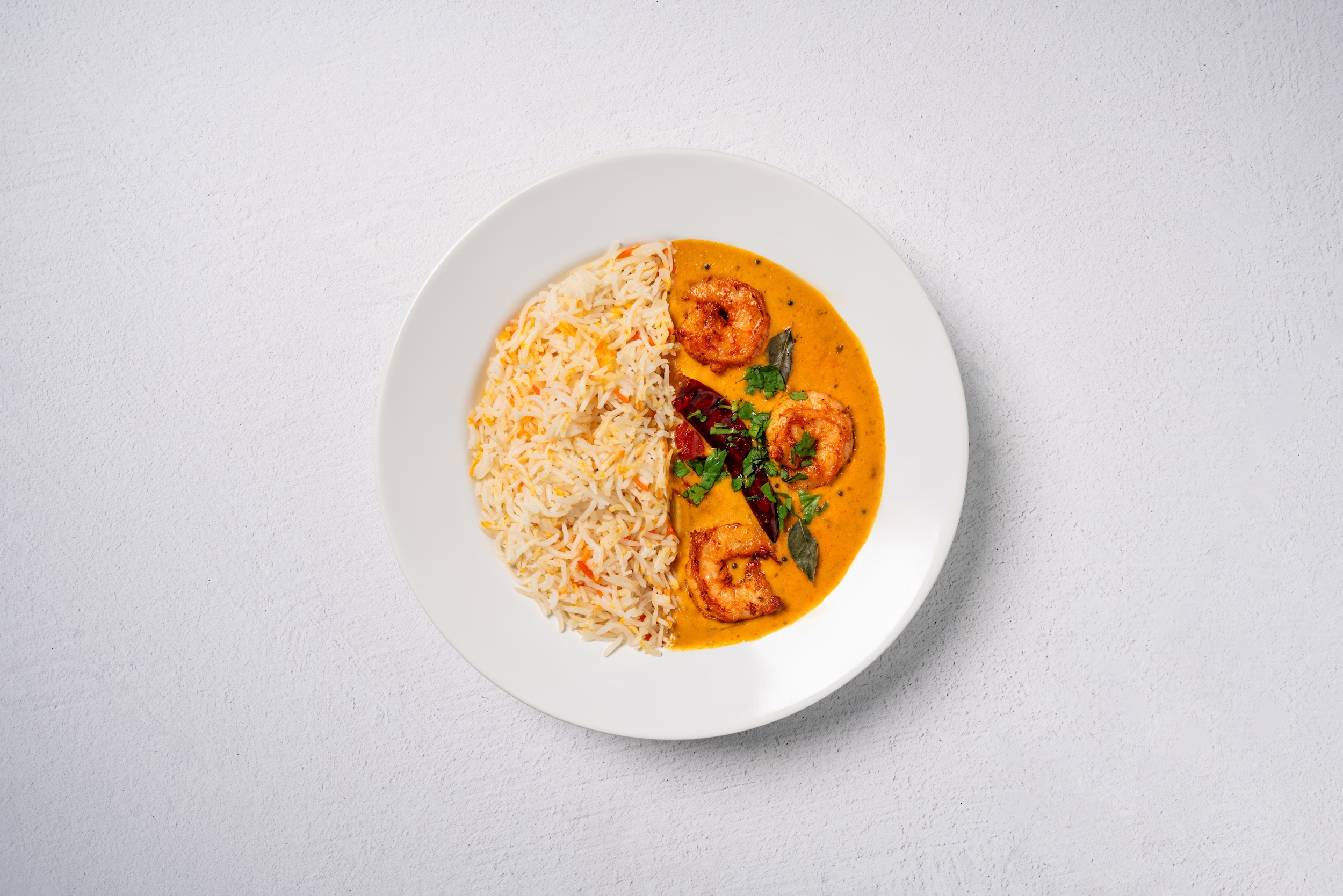 Coconutty curry with Indian kick. Curry infused with coconut milk, curry leaves, red chilis, cilantro and mustard seeds.