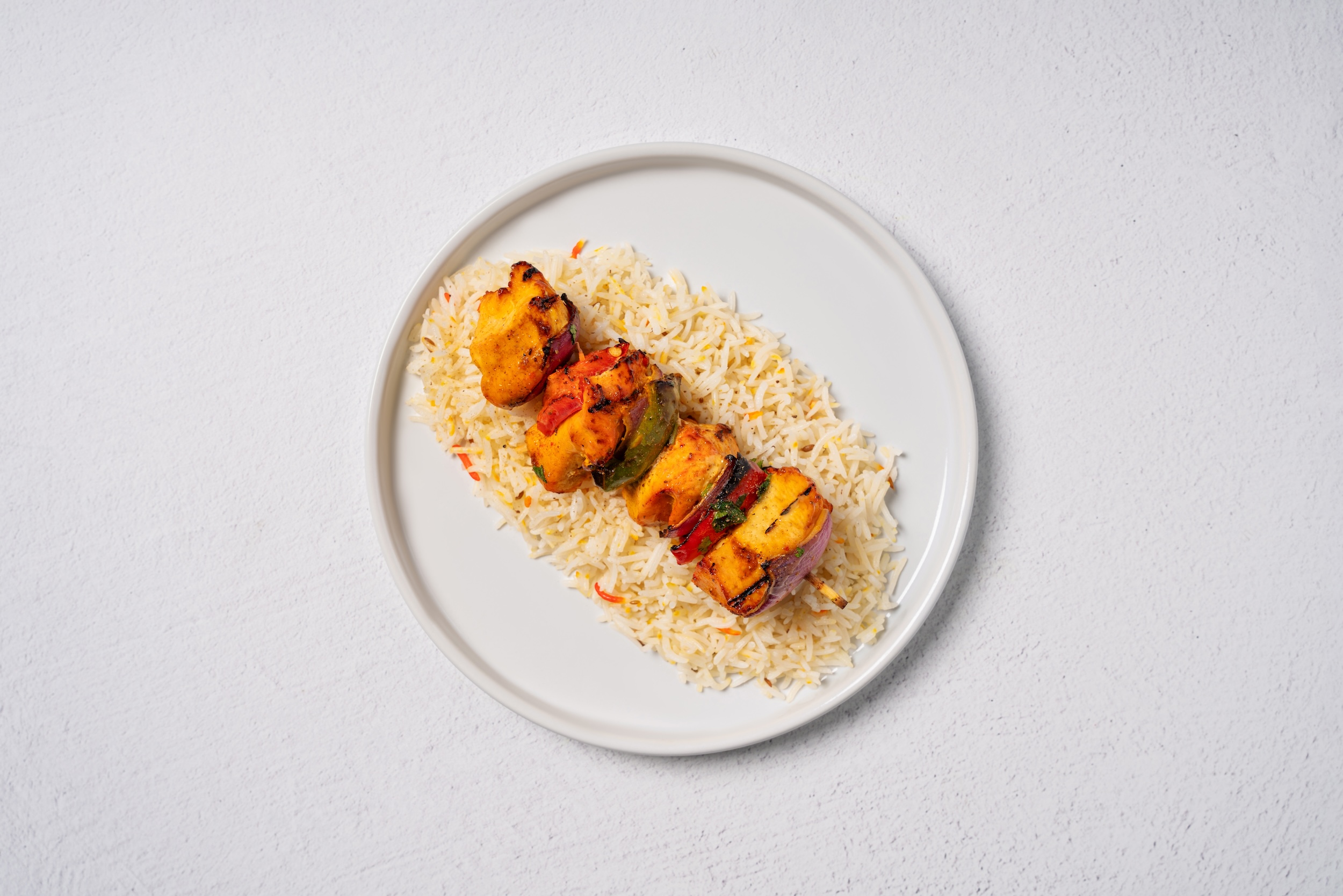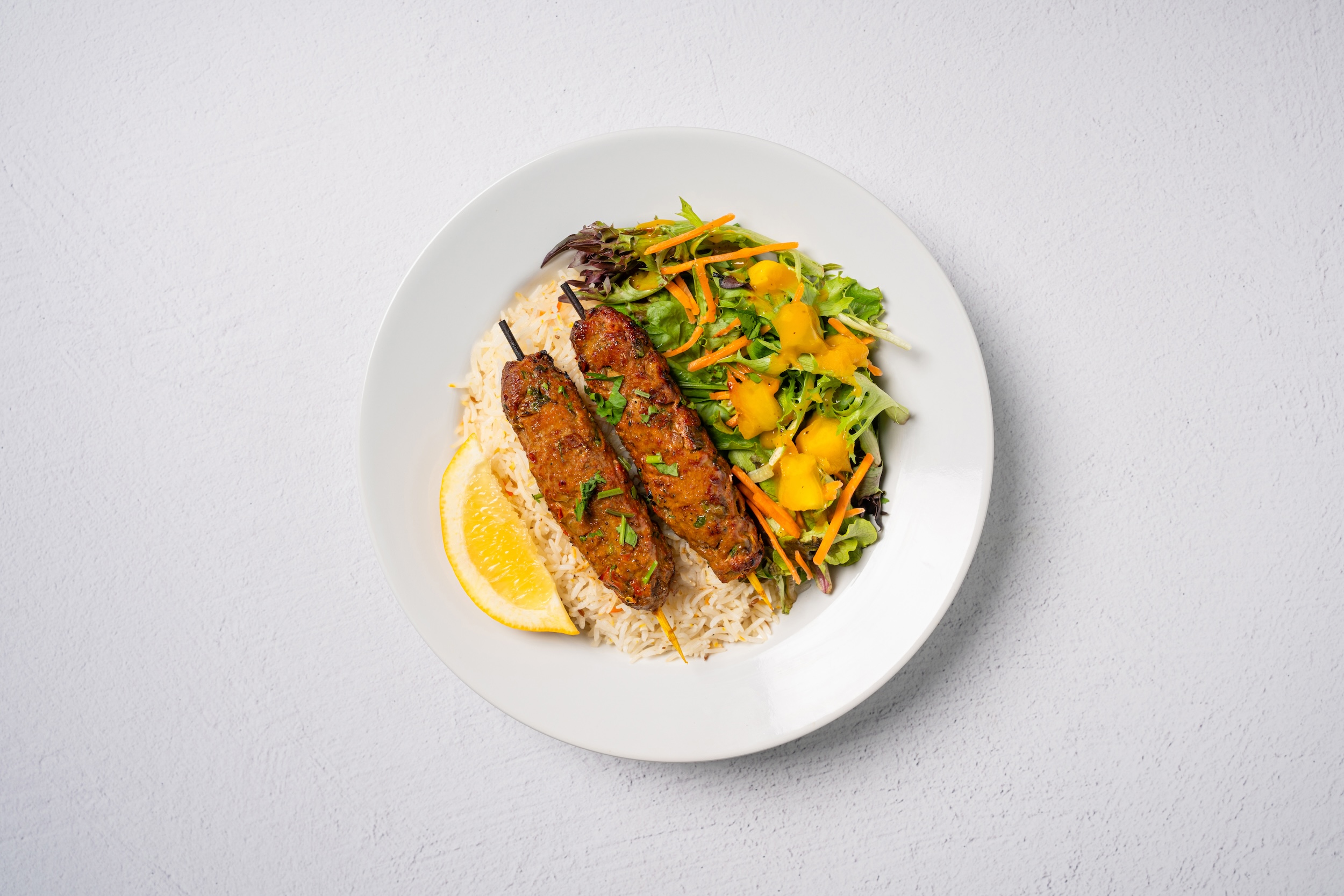 2 Skewers served on Basmati rice and side Mango Salad. Comes with Tikka sauce.