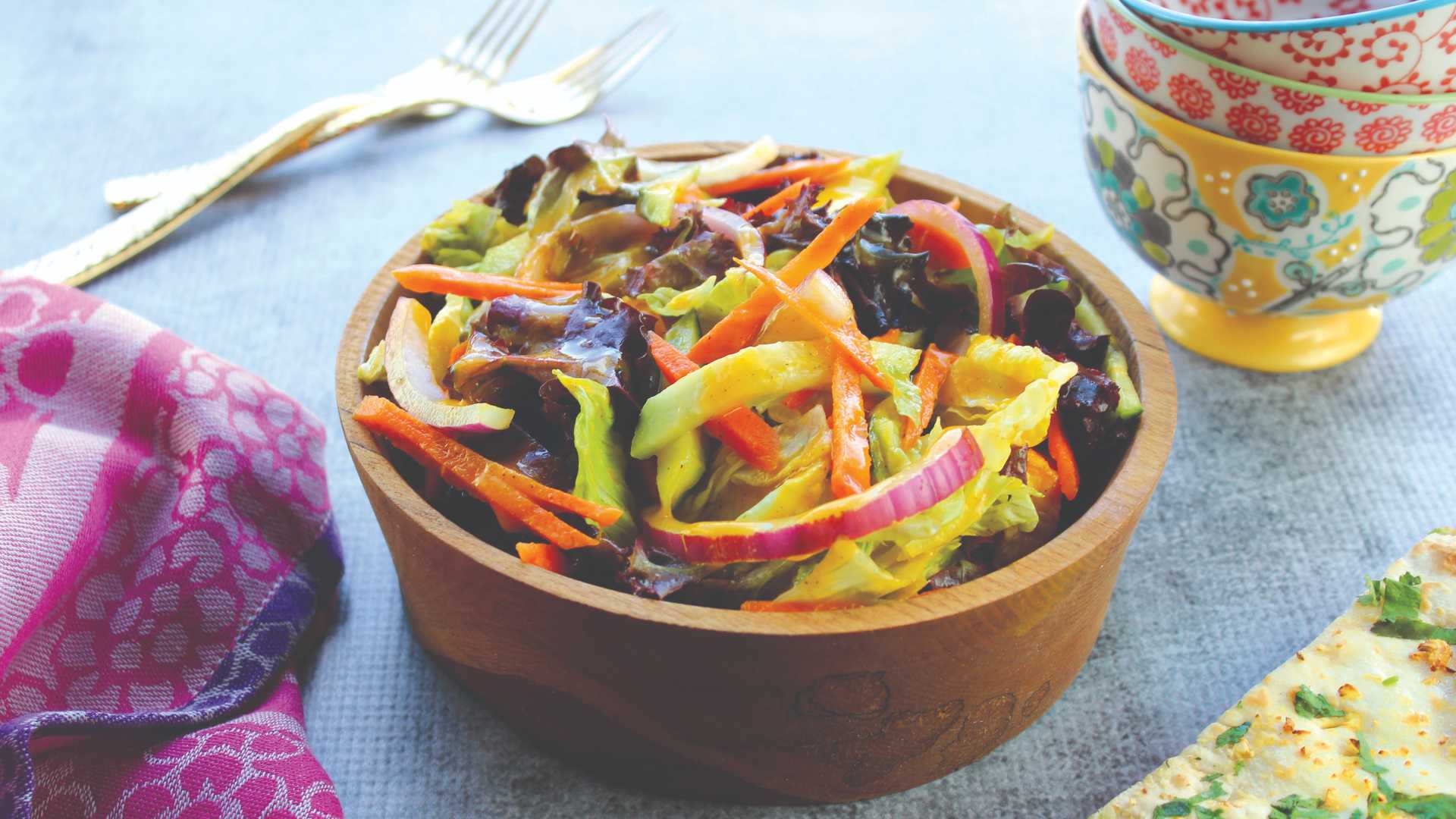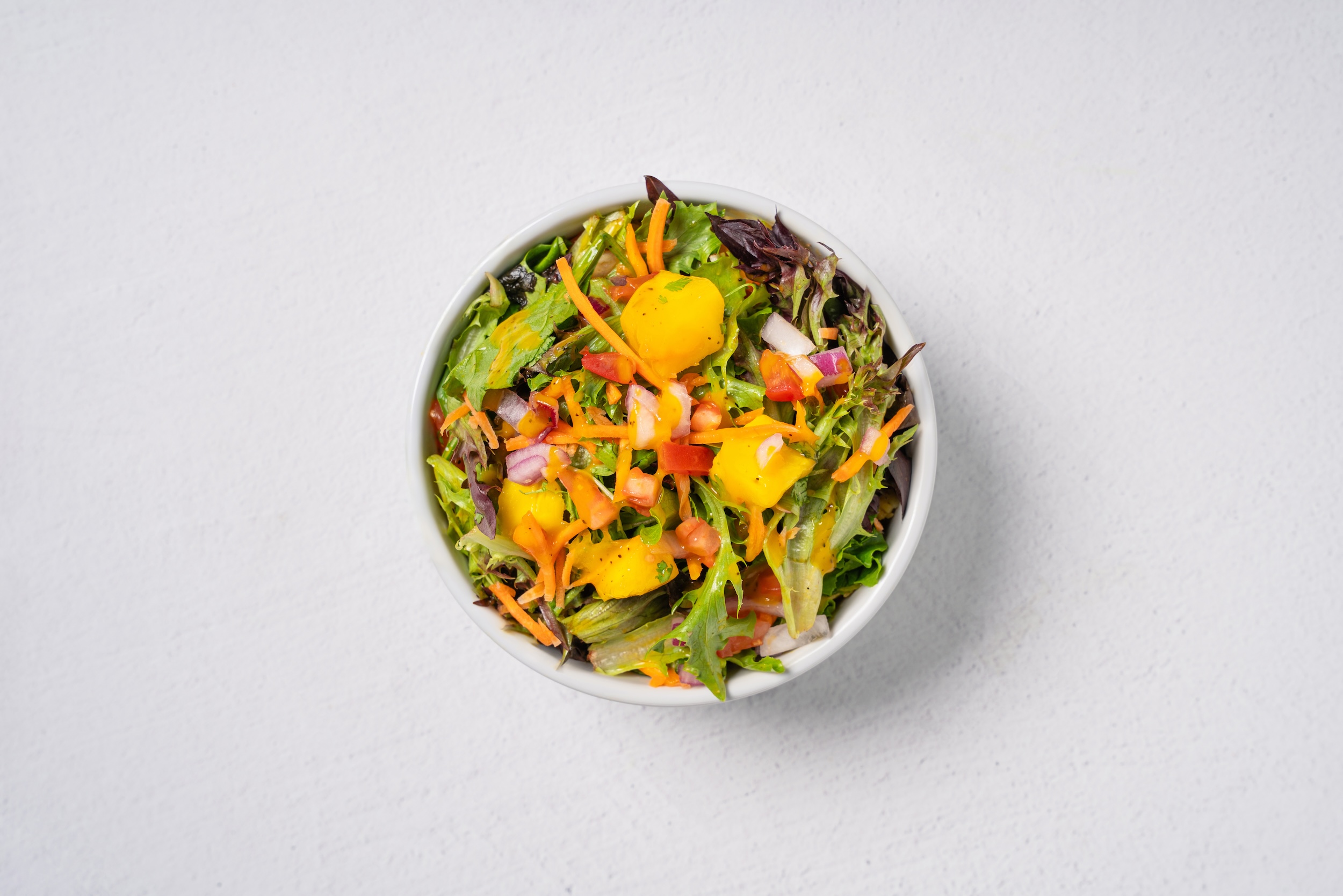 Side salad with Arcadian harvest, carrots, onions, tomatoes, house made mango vinaigrette, topped with fresh mangos.