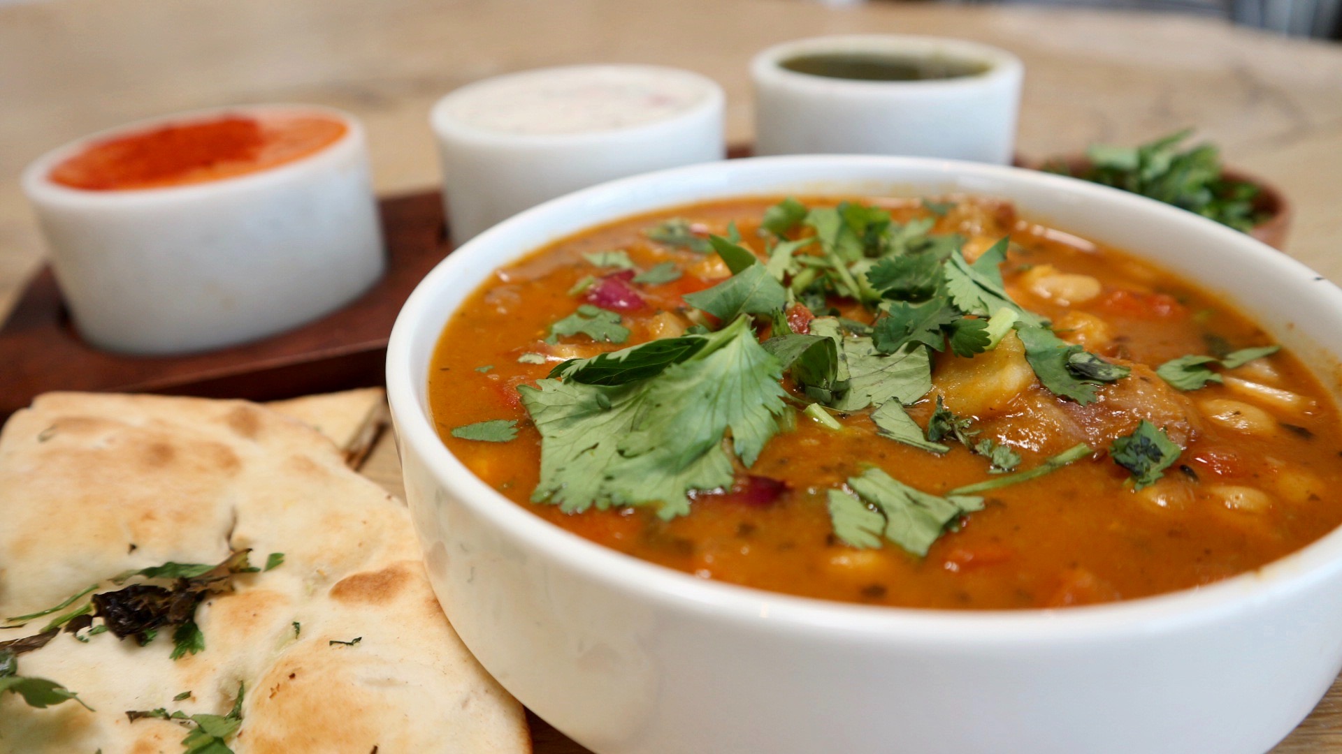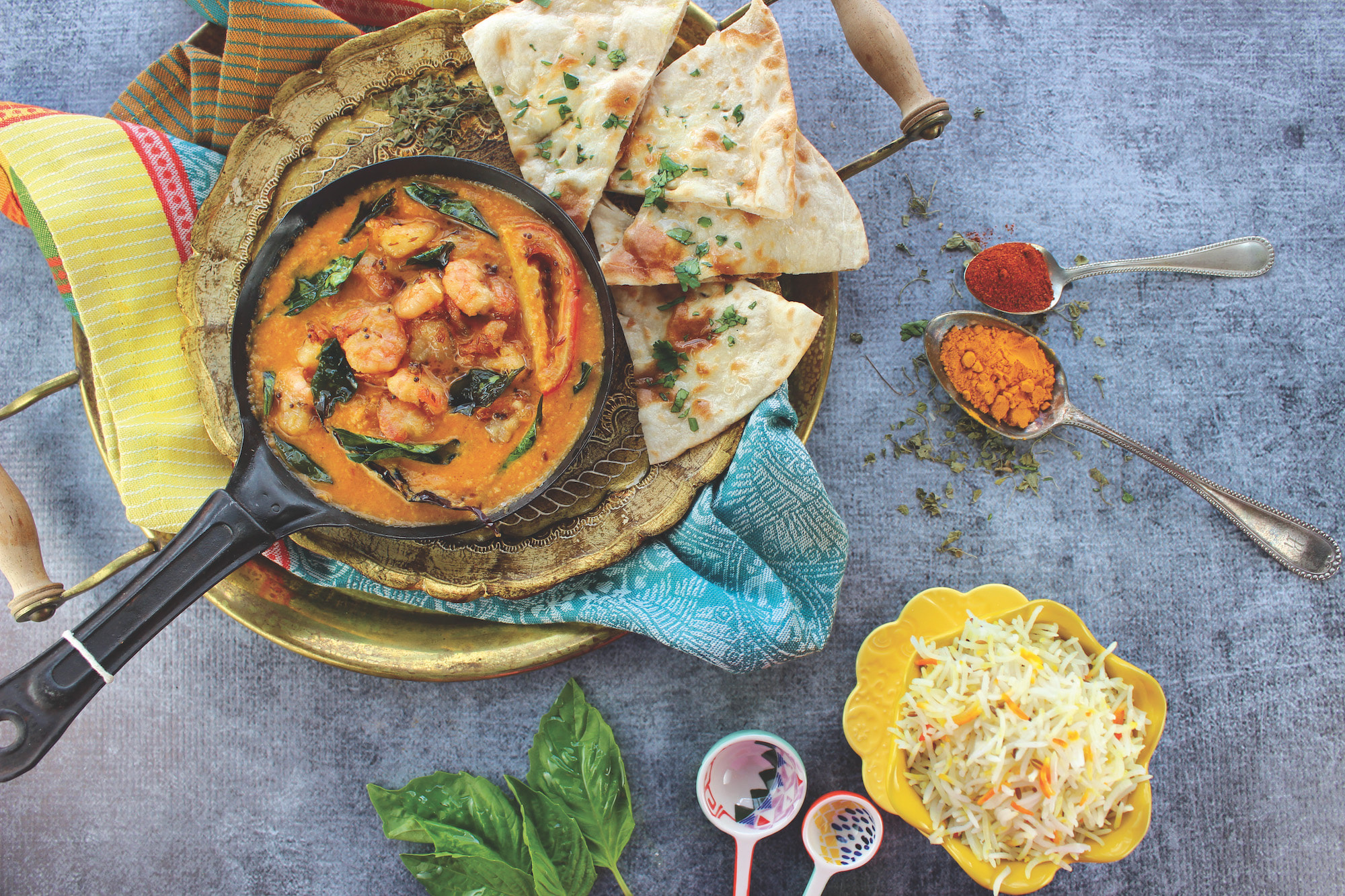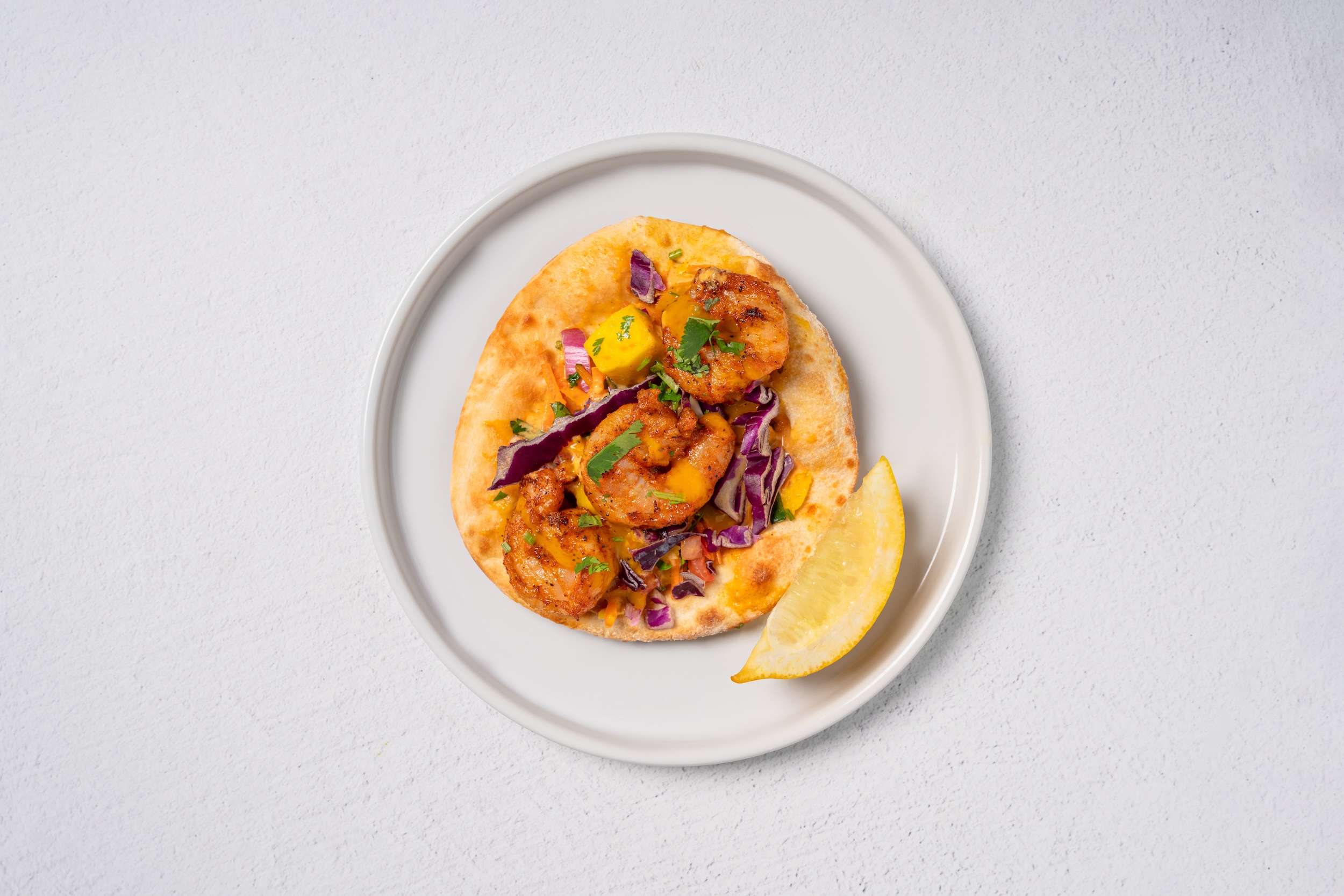 Crispy shrimp, mango de gallo, cilantro, coconut curry sauce, hand rolled naan