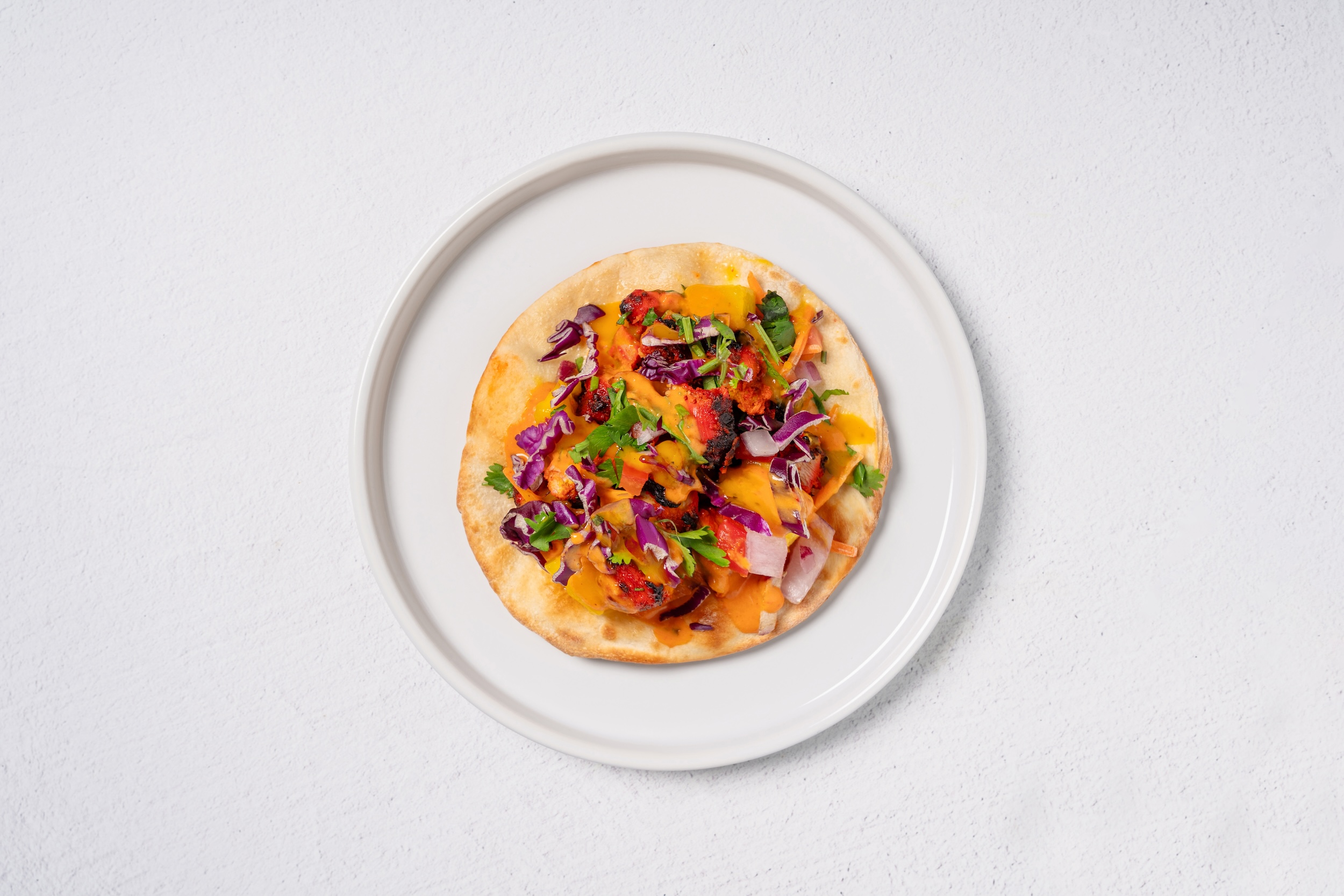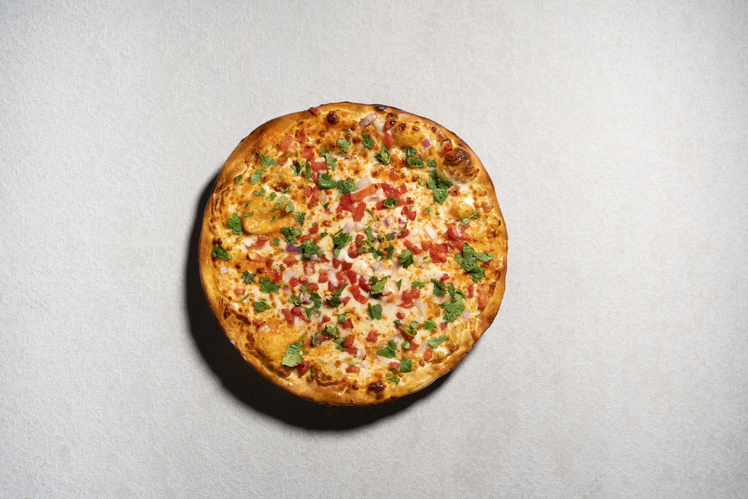 Signature tikka sauce, mozzarella, red onons omaloes clantro