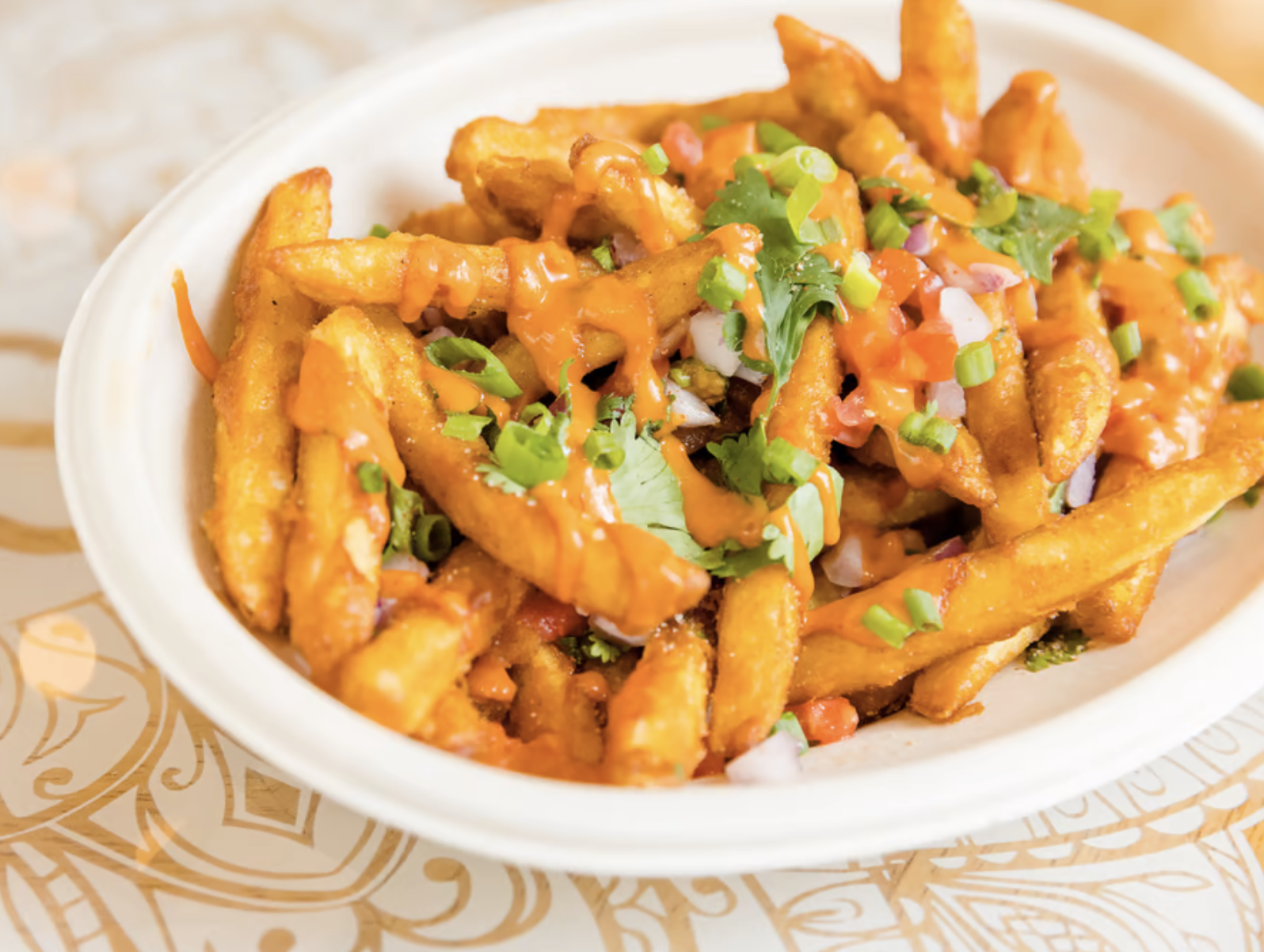 Loaded fries doused with tikka masala, onions, scallions, cilantro and covered in sweet and spicy secret spices