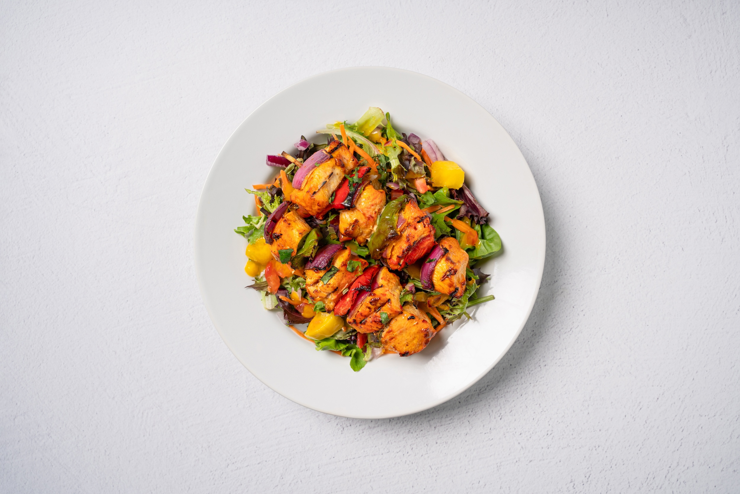 Organic Arcadian spring mix, carrots, tomatoes, onions, & fresh mangoes. Dressed with our house mango vinaigrette.