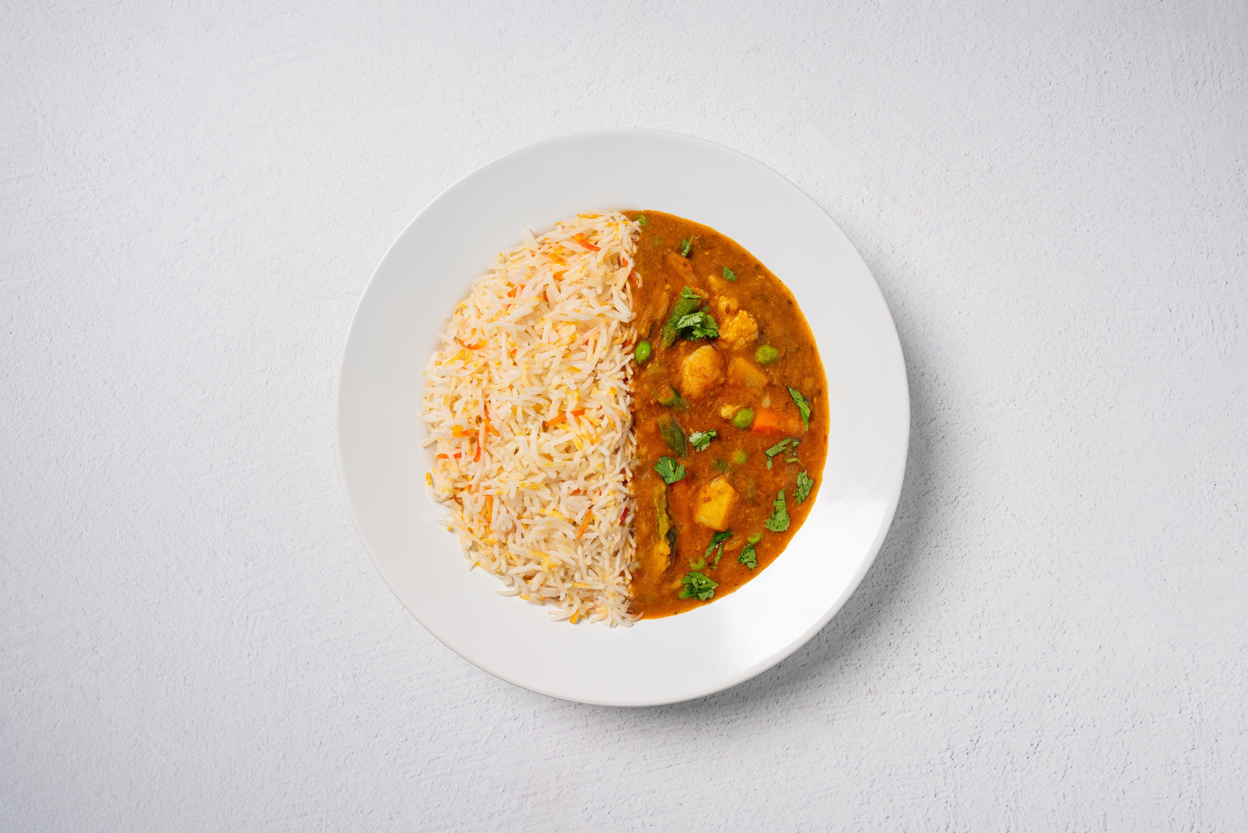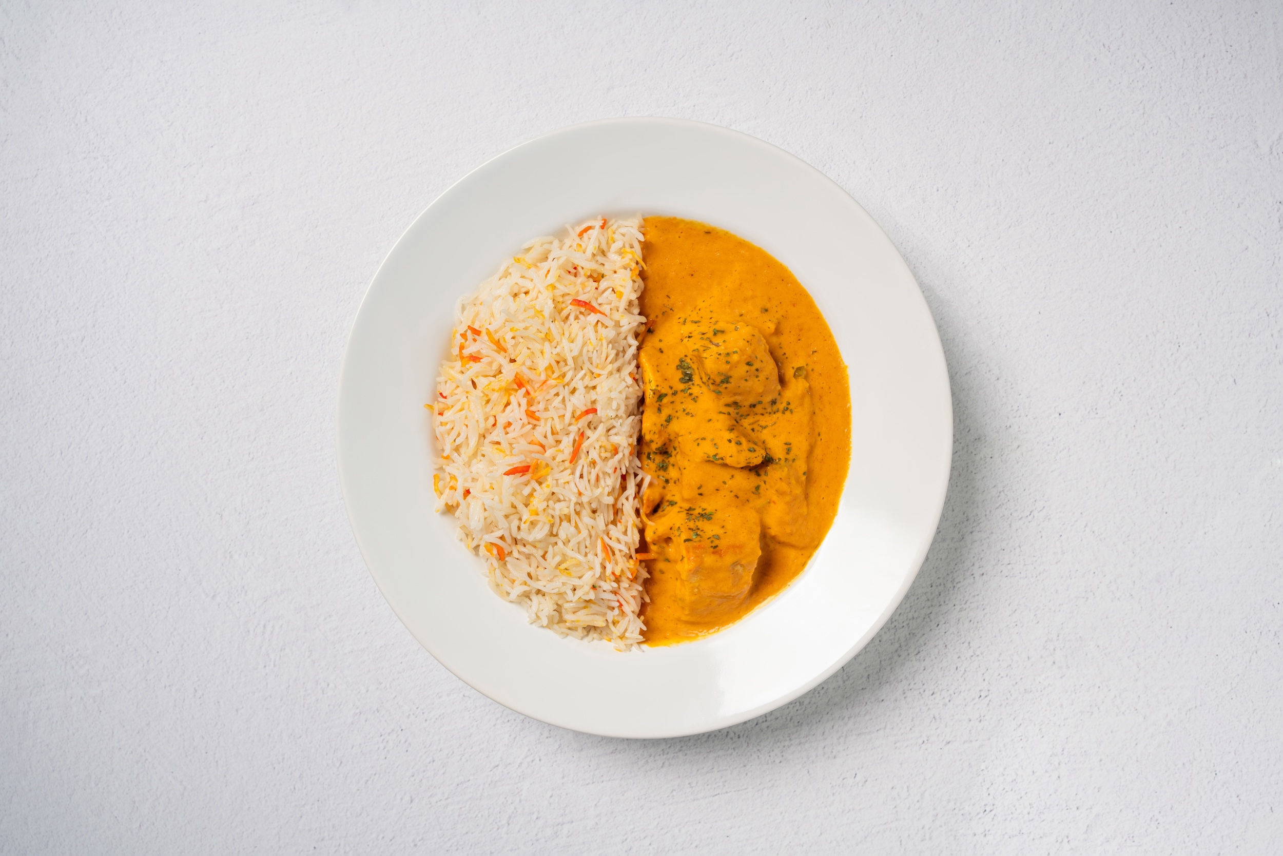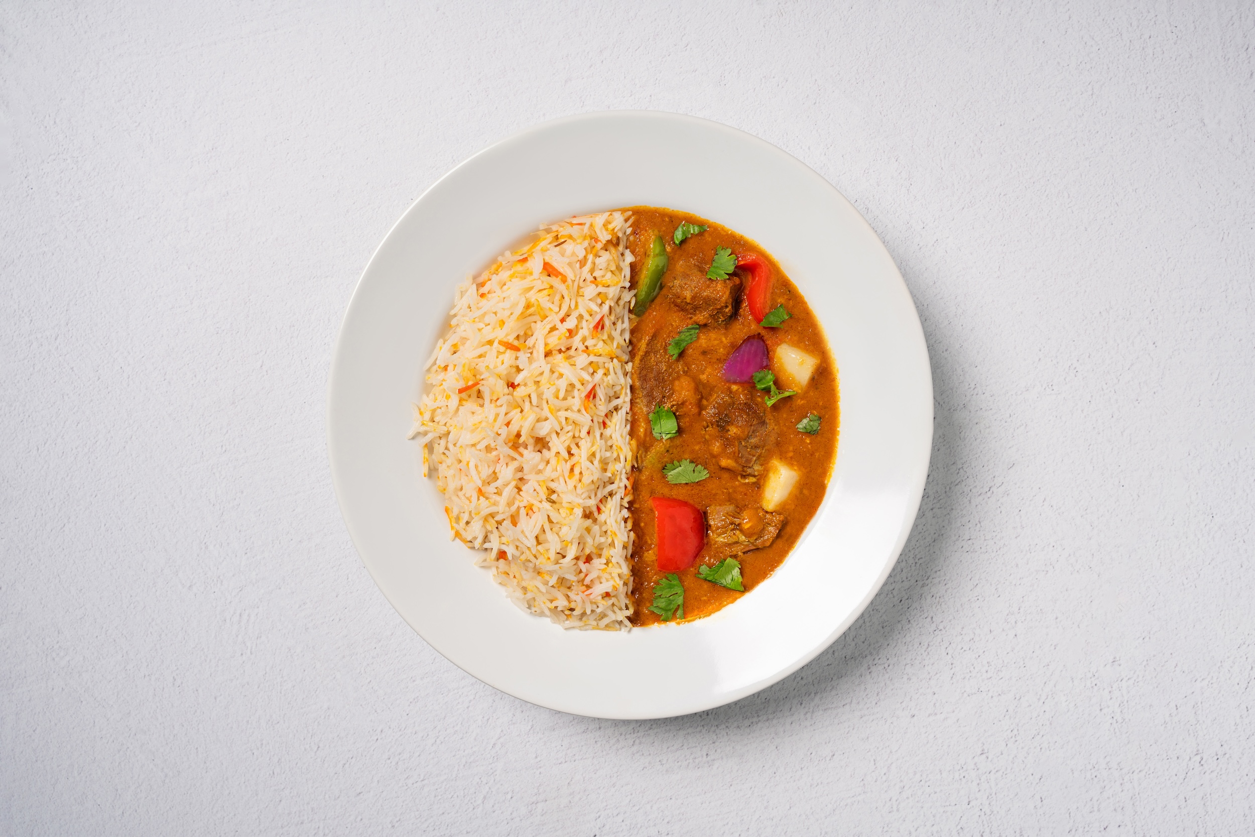 Aromatic long-grain basmati rice infused with clarified butter (ghee) and delicious blend of spices. Garnished with fresh cilantro and red onions. Served with house-made raita crema and curry sauce.