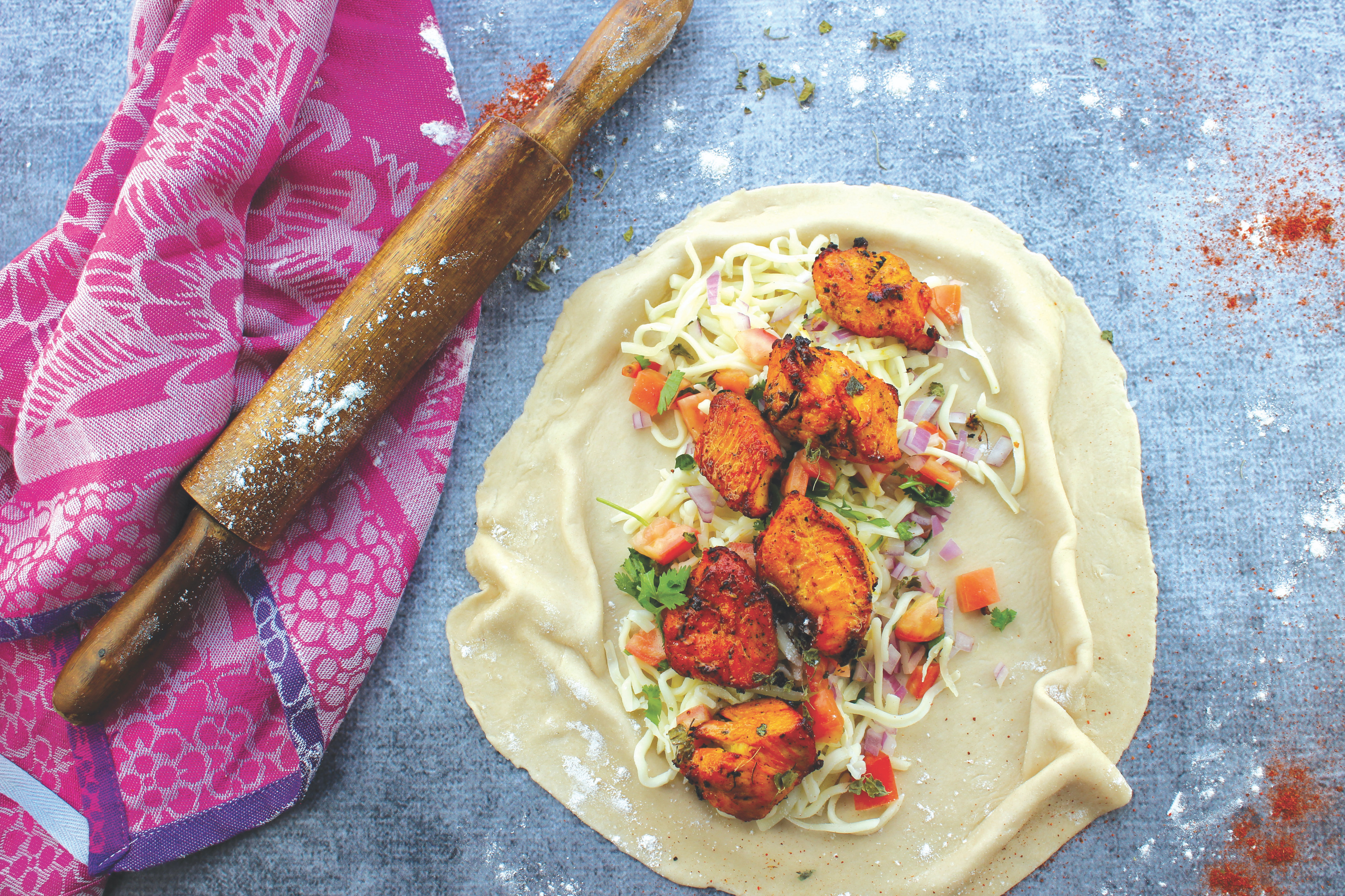 Naan dough, tikka masala sauce, cheese