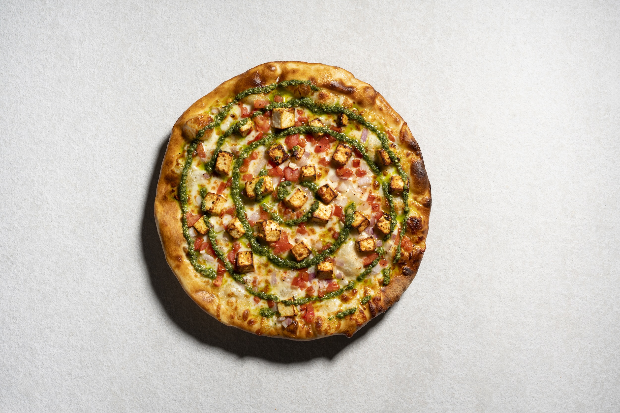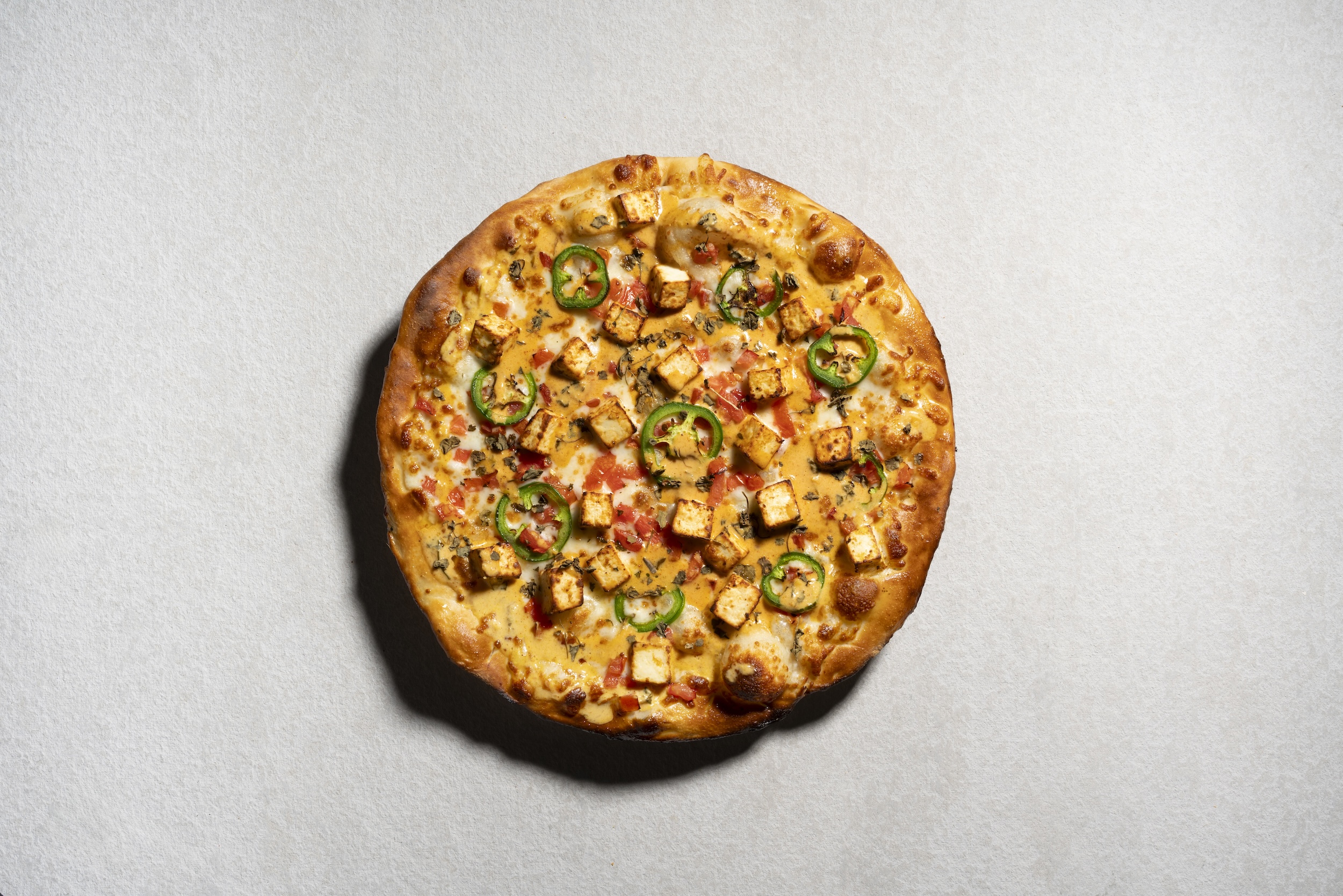 Spicy malai sauce, thin sliced seasoned paneer, mozzarella, hot peppers, tomatoes & garnished with dry methi leaves