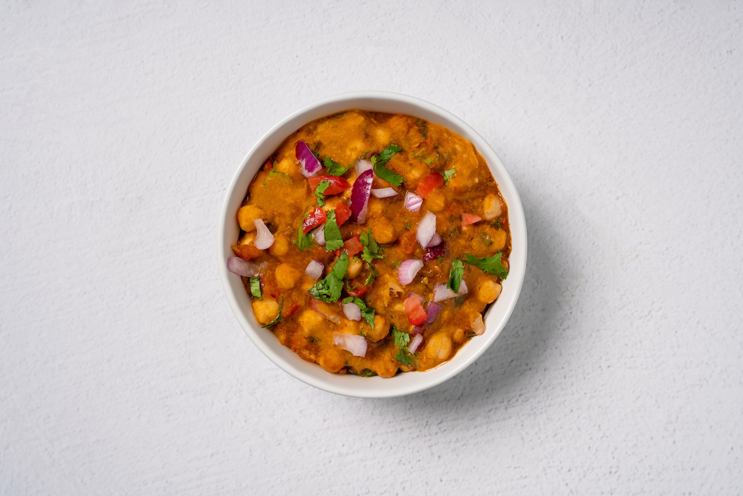 Stewed chickpeas + red potatoes in our traditional curry sauce with spices.