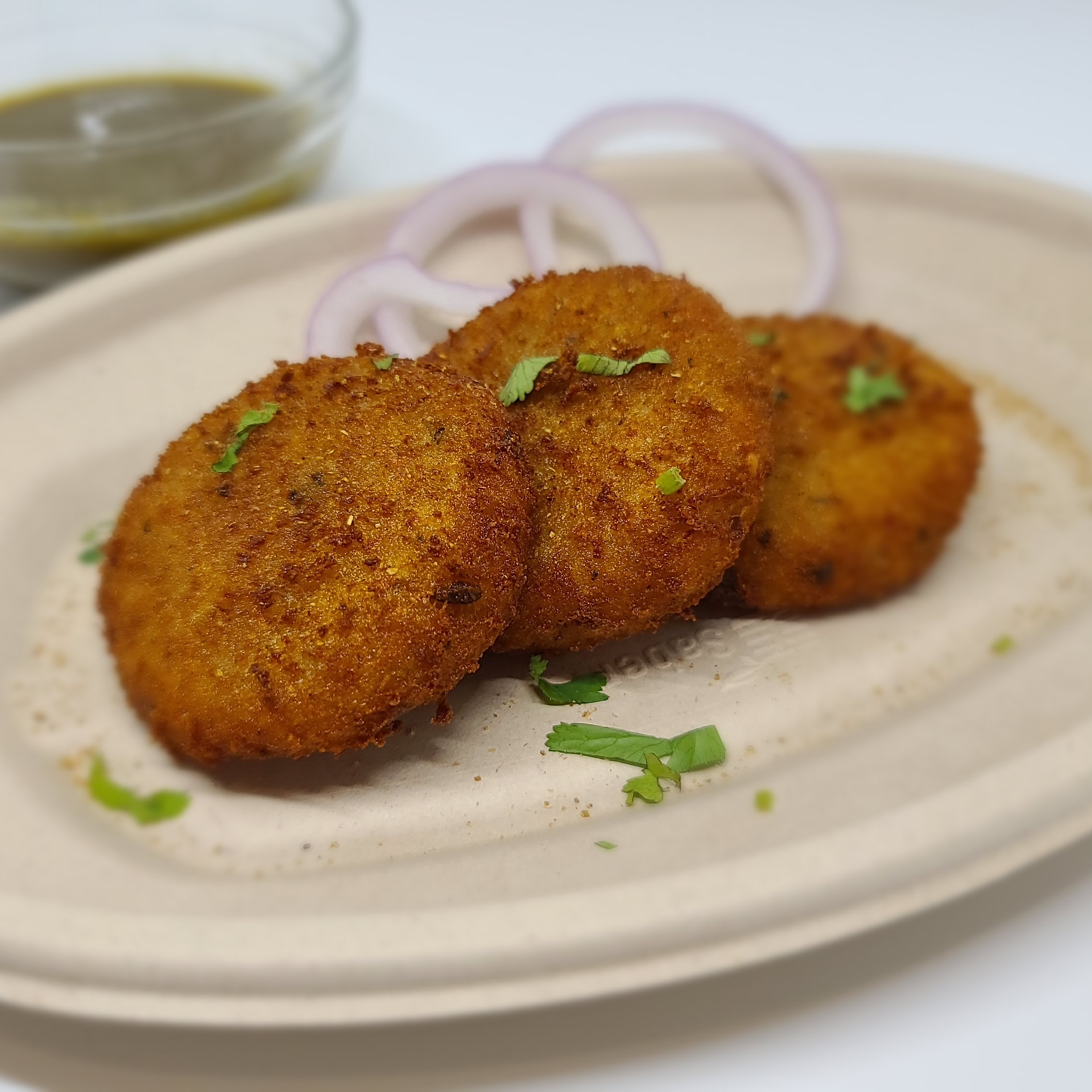 Seasoned & crispy vegetable patties made with potatoes, paneer, green peas, carrots, and cilantro.