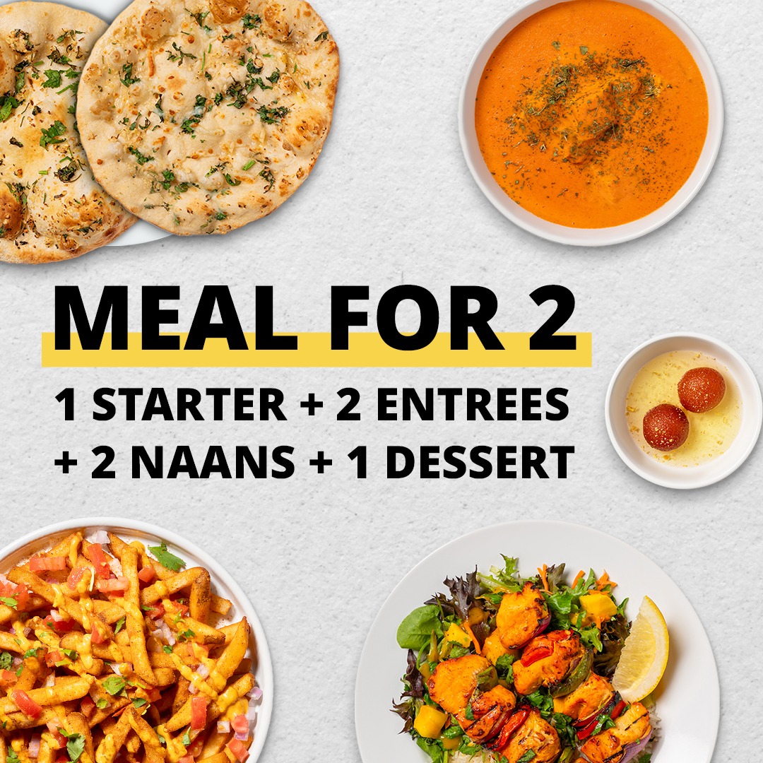 A complete meal for 2 > One Appetizer + Two Entrees with Basmati Rice + Two Naans + A Sweet. No substitutions allowed.