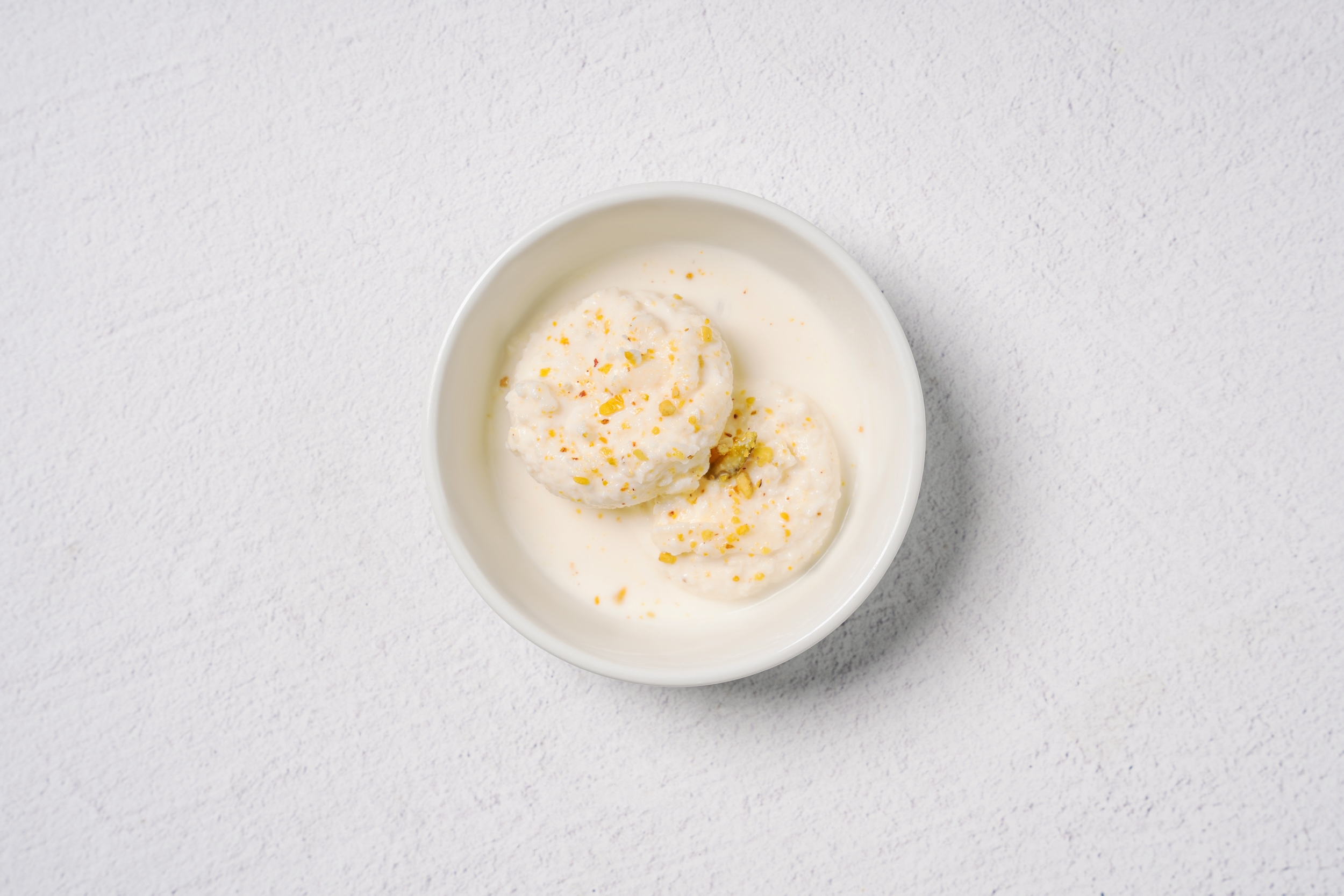 Fresh cheese patties served cold in sweetened milk.