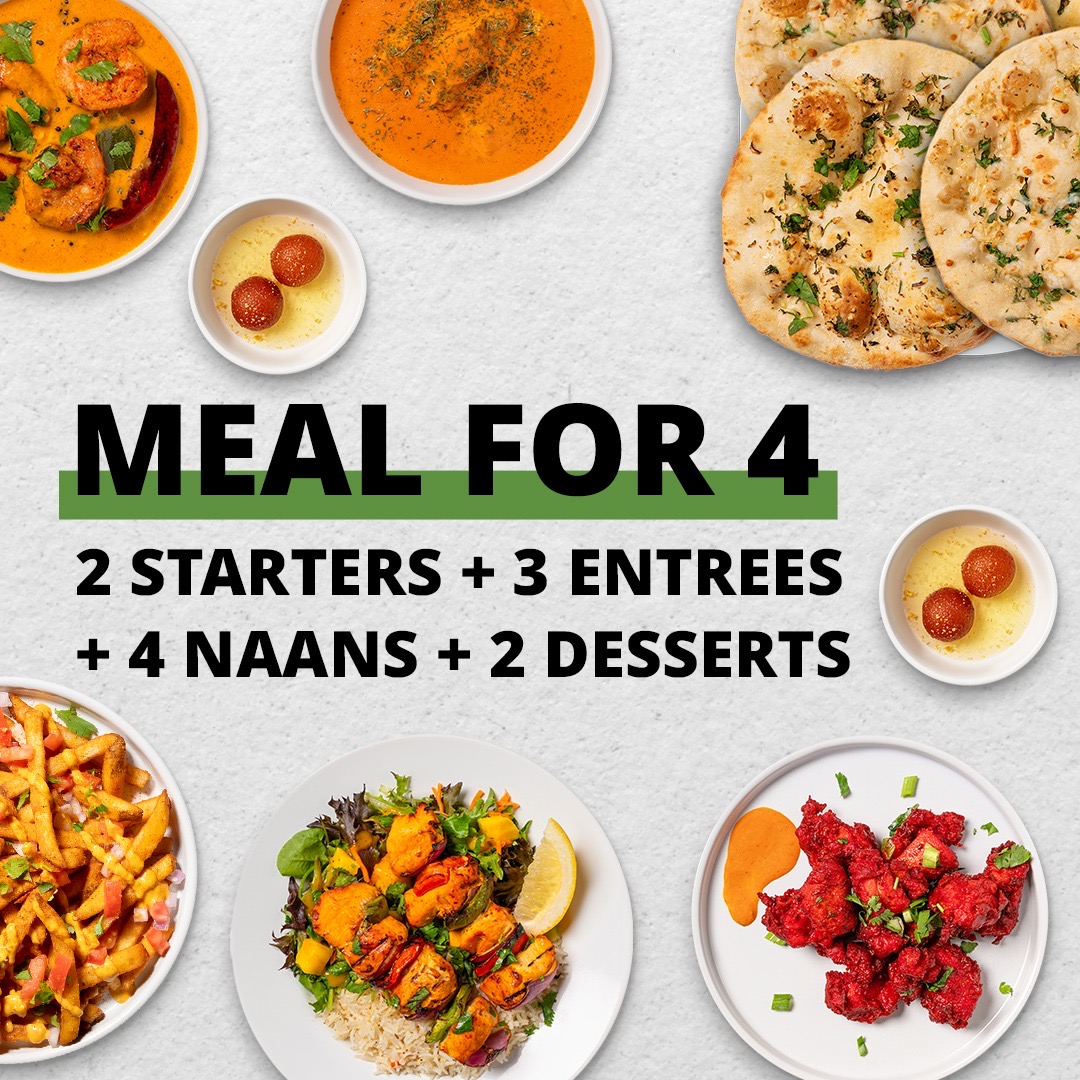 A feast for your family. Includes two starters, 3 entrees with Basmati Rice, 4 Naans & 2 Desserts. No substitutions allowed.